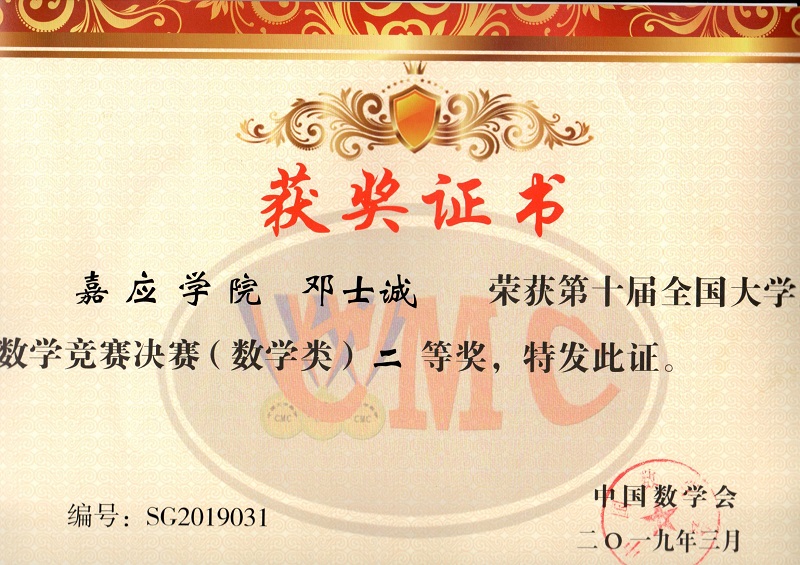 2019年3月29日至31日,由中国数学会主办、哈尔滨工业大学承办的“第十届全国大学生数学竞赛”决赛在冰城哈尔滨举行。我院16级学生邓士诚同学获数学专业高年级组二等奖。