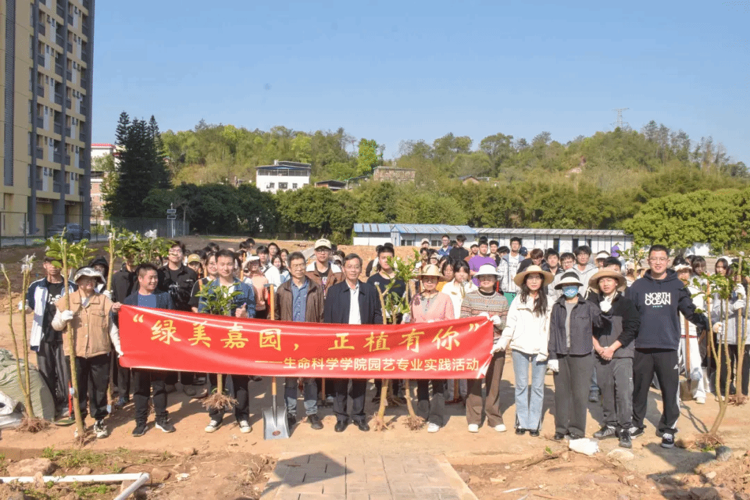 春风和畅的三月天,嘉应学院东区生命科学学院教学实践基地里一片热火朝天。3月22日,生科院147名园艺专业学子在苏贤聚、张鲁斌、杨期和、常金梅、高桂珍、郭天麒、刘新生、关红玲、谢宝星、程晓婕、苏凌云等老师带领下,以“绿美嘉园,正植有你”为主题,用专业实践响应国家“双碳”战略和“绿美广东”建设,为校园种下一片新绿。