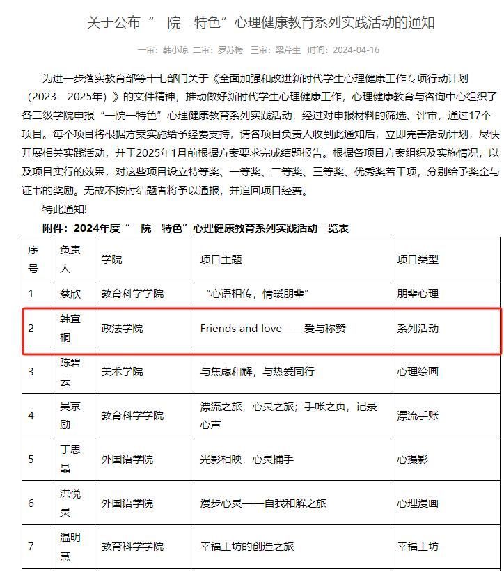 为加强学生心理健康知识宣传,引导青年大学生树立健康人生观念,提高心理素质,促进大学生心理健康教育,学院积极发动学生参加学校“一院一特色”心理健康教育系列实践活动申报。其中社会工作专业2206班朋辈互助小组主持的“Friends and love ——爱与称赞”项目获得立项。