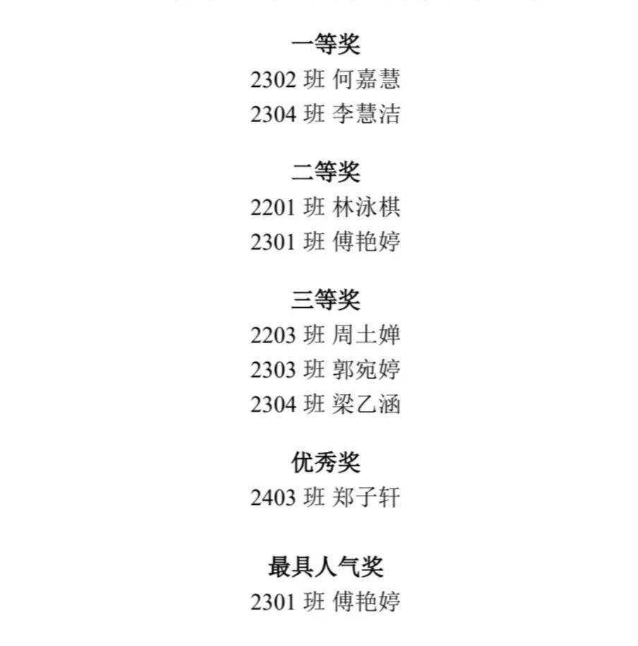 经选手们激烈的竞争和评委的综合评审,最终比赛结果如下: