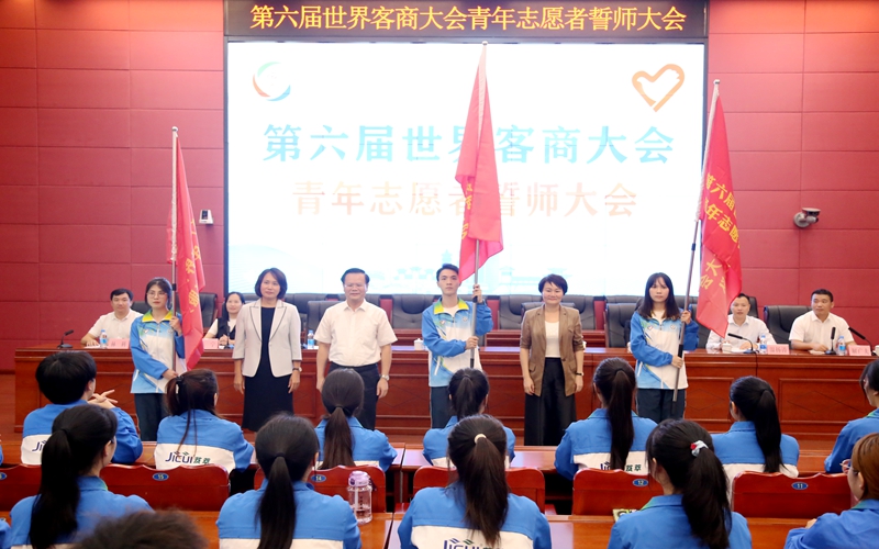 为全面做好第六届世界客商大会志愿服务工作,充分展示我市良好的城市形象和梅州青年志愿者“奉献、友爱、互助、进步”的精神风貌,10月25日下午,第六届世界客商大会青年志愿者誓师大会在我校举行。会前,学校党委书记吴琦与志愿者们亲切会面,并提出殷切期望。市委常委、秘书长曾永祥,市政协副主席、第六届世界客商大会筹备办驻办常务副主任曾碧玉,我校党委常委、副校长张丽霞等领导和我校青年志愿者300余人参加誓师大会。曾永祥、曾碧玉、张丽霞共同为第六届世界客商大会青年志愿者服务队授旗。