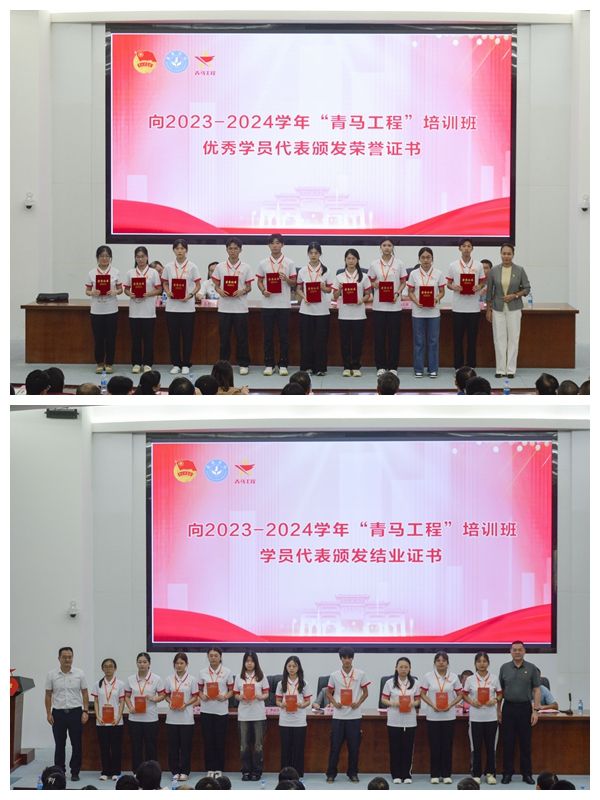会上,张丽霞向新一期的“青马工程”培训班学员代表授旗,“青马工程”培训班优秀学员代表分别作了发言。并向2023—2024学年“青马工程”培训班学员代表和优秀学员代表颁发了结业证书和荣誉证书。
