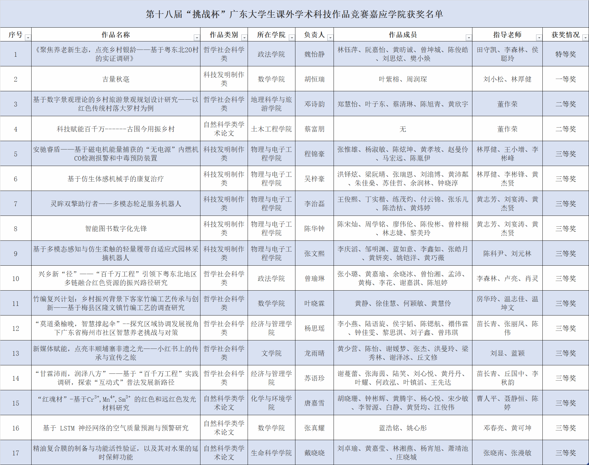“挑战杯”广东大学生课外学术科技作品竞赛,是由共青团广东省委等联合主办,旨在激发大学生创新精神,提升实践能力。本次第十八届“挑战杯”广东大学生课外学术科技作品竞赛终审决赛在5月17日至19日在肇庆学院成功举办,吸引了全省161所高校逾20万名大学生参赛,竞争激烈。参赛对象为省内高校全日制专科生、本科生、硕士研究生,主赛道分为自然科学类学术论文、哲学社会科学类社会调查报告、科技发明制作三个类别,在决赛期间,我校参赛团队表现优异,经过激烈角逐,最终斩获特等奖1项、一等奖1项、二等奖2项、三等奖13项,共计17个奖项的骄人成绩。优异成绩的取得离不开各二级学院的全力支持和专业教师的悉心指导。各二级学院充分发挥学科优势,为参赛团队提供实验室、设备和经费支持;各专业指导教师从选题论证、方案设计到作品完善全程跟进指导,为项目质量提供了坚实保障。
